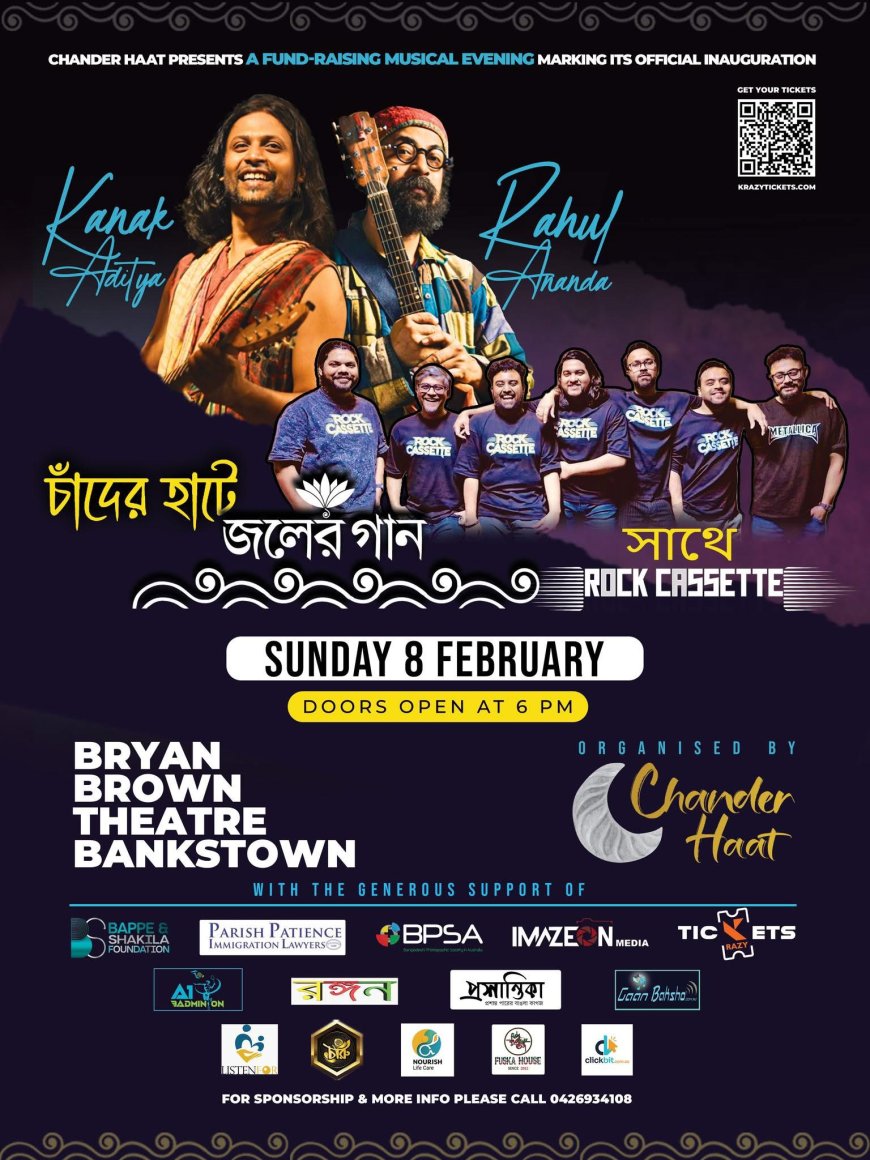 সংগীতপ্রেমীদের জন্য এক আনন্দঘন চমক নিয়ে সিডনি আসছেন ‘জলের গান’-এর স্রষ্টা, জনপ্রিয় শিল্পী রাহুল আনন্দ ও কনক আদিত্য। আগামী ৮ ফেব্রুয়ারি, রোববার সন্ধ্যায় সিডনির ব্যাংকসটাউনের ব্রায়ান ব্রাউন থিয়েটার হলে অনুষ্ঠিত হবে এই বিশেষ সংগীত আয়োজন। অনুষ্ঠানটির আয়োজক প্রবাসী ছাত্রছাত্রীদের সহায়তাকারী স্বেচ্ছাসেবী সংগঠন ‘চাঁদের হাট’।